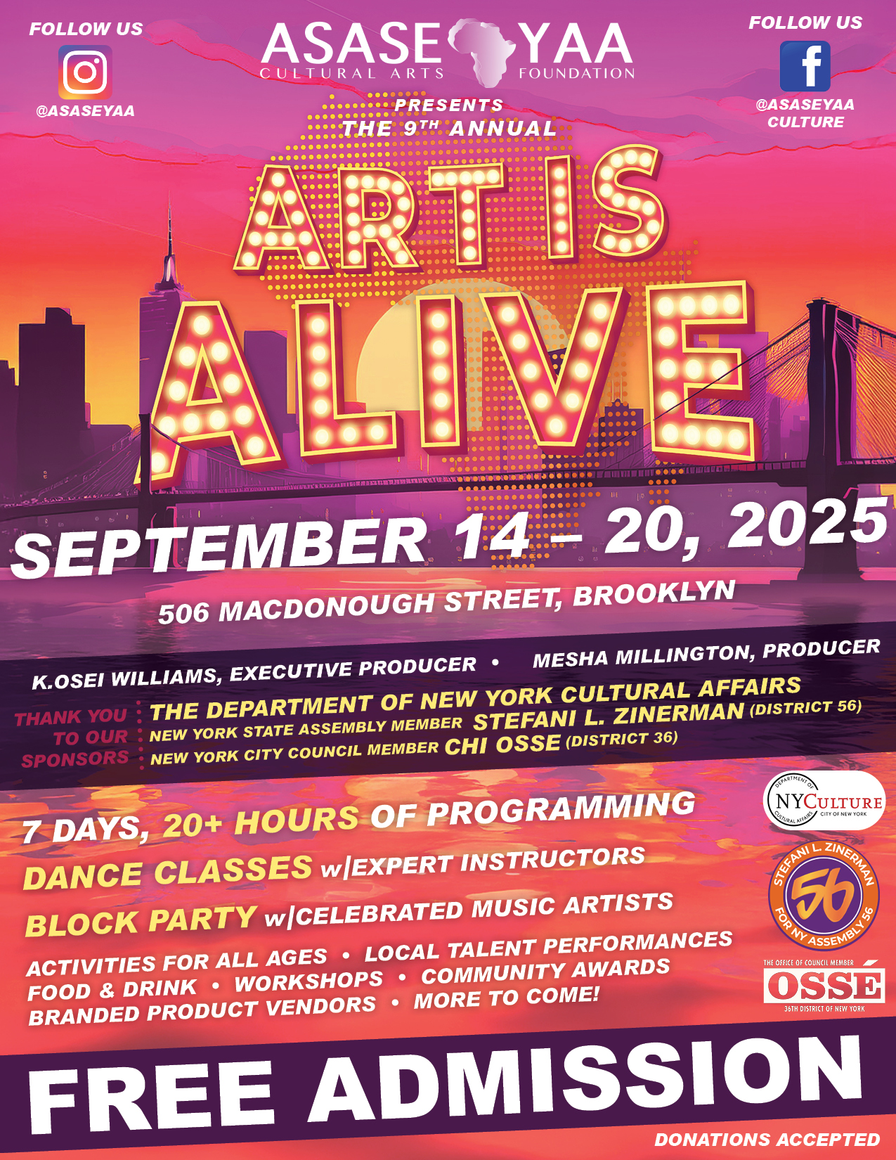The Asase Yaa Cultural Arts Foundation is thrilled to present the 9th Annual Art Is Alive Festival, September 14–20, 2025! 🎉  This dynamic, multidisciplinary celebration honors over 25 years of our service to the Brooklyn community and the richness of African and African diasporic traditions.